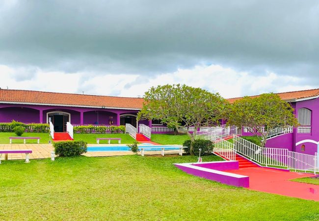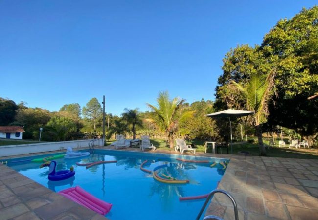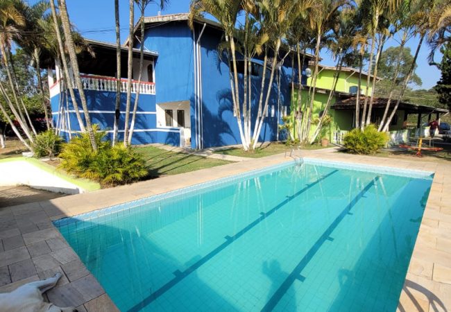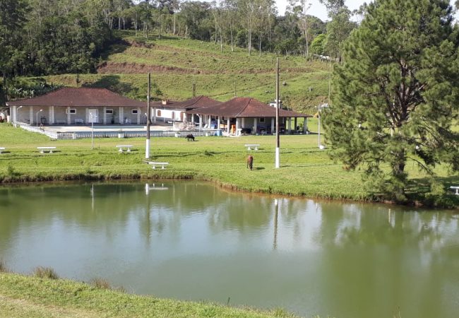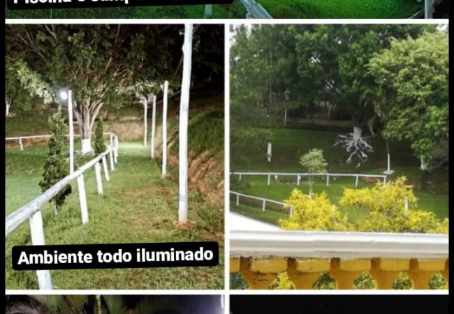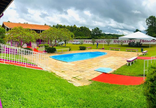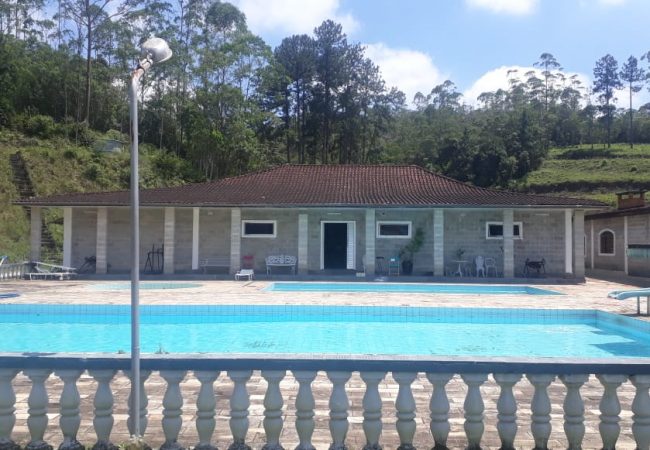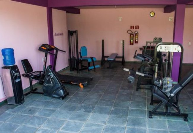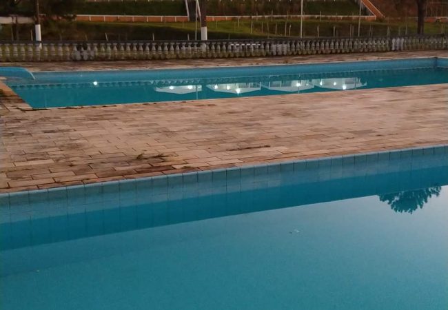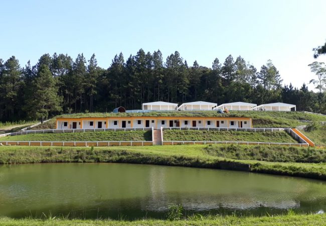 Ambientes equipados com piscina, academia, campo e quadra para esportes, refeitório, além de uma área ampla.